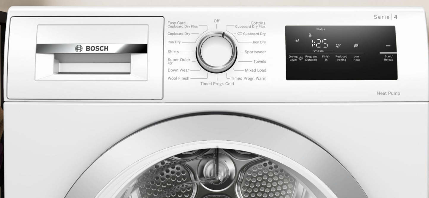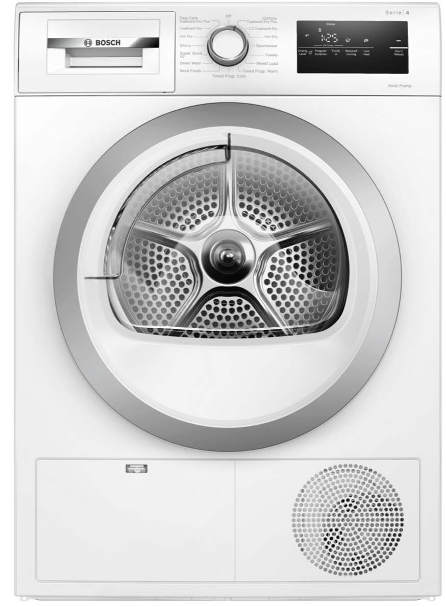 Use this Bosch heat pump tumble dryer to dry your laundry quickly and efficiently. With an 8kg capacity and easy-to-use LED display, drying your clothes has never been easier. Load up your washing and Auto Dry will finish it to the exact level of dryness required.