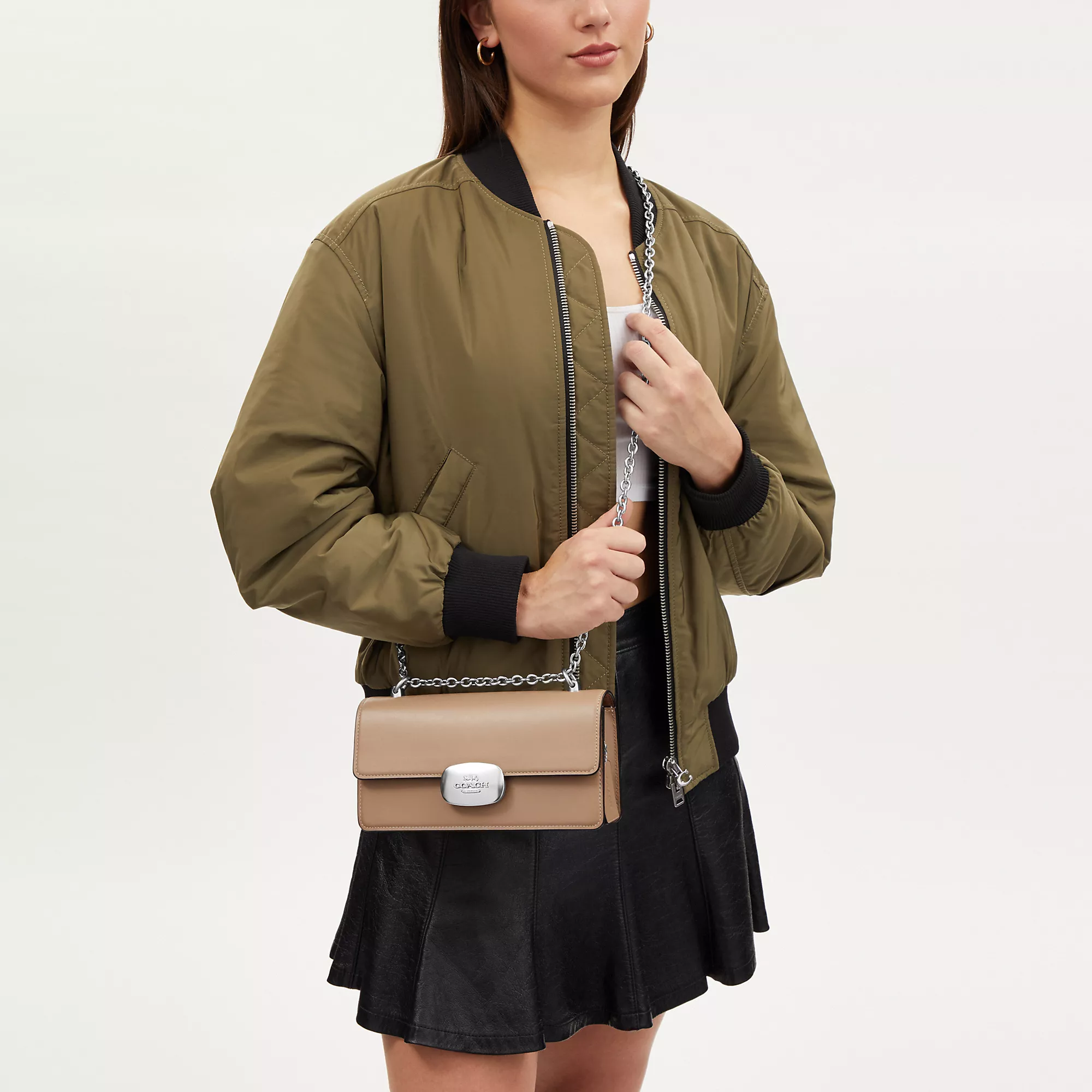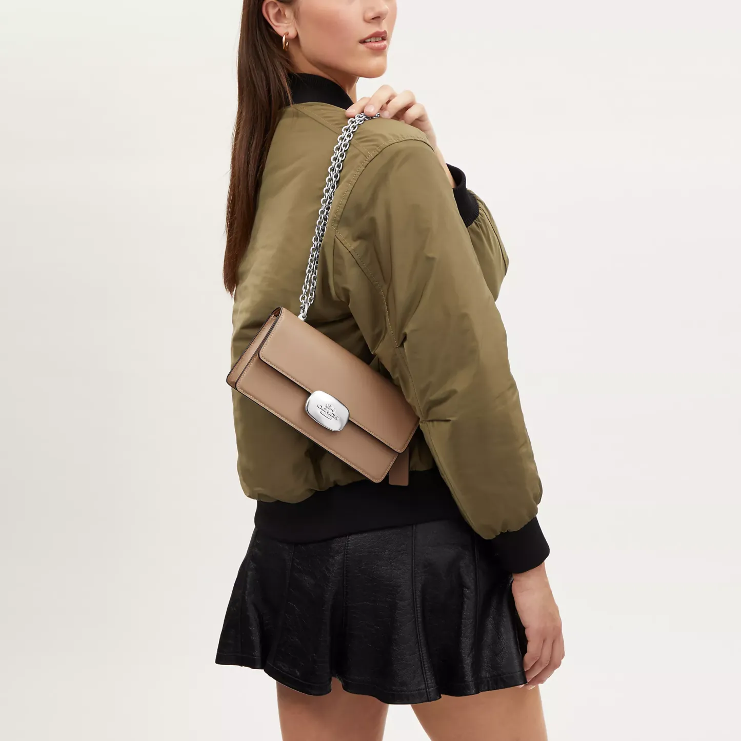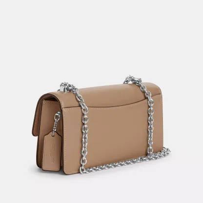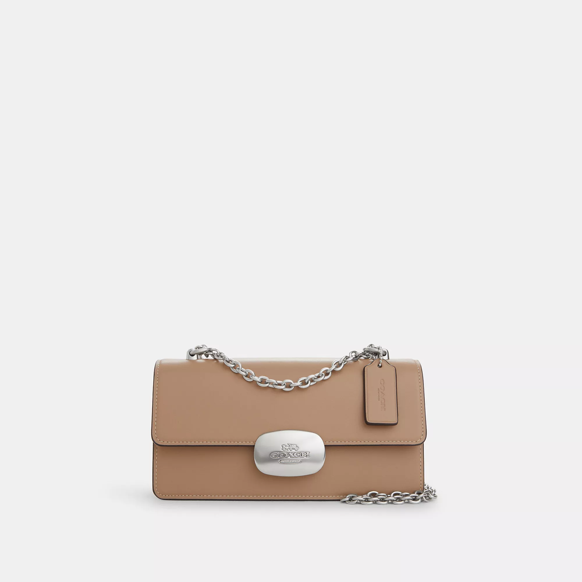 Refined calf leather Inside zip and multifunction pockets Snap closure fabric lining Outside open pocket Chain strap with 22 1/2 drop for shoulder or crossbody wear 9 (L) x 4 3/4 (H) x 2 1/4 (W) Style No. CP008 | Coach Outlet Eliza Flap Crossbody - Beige