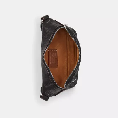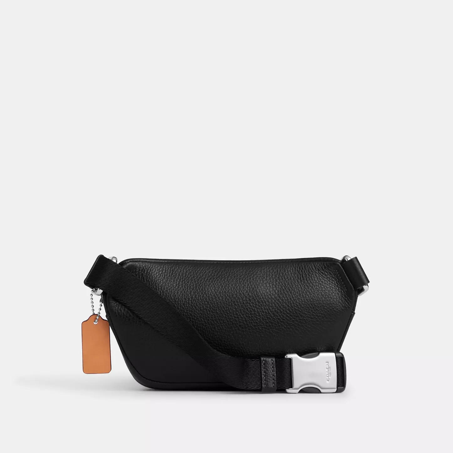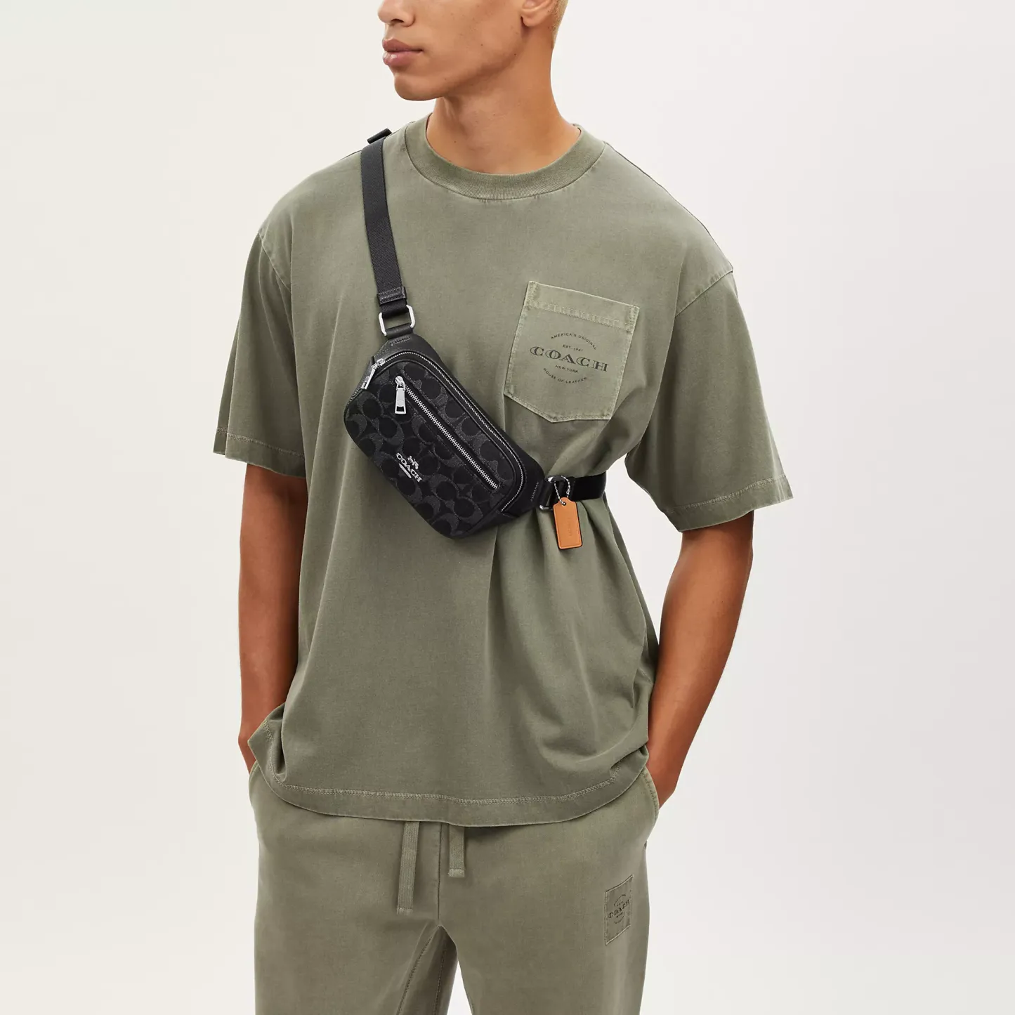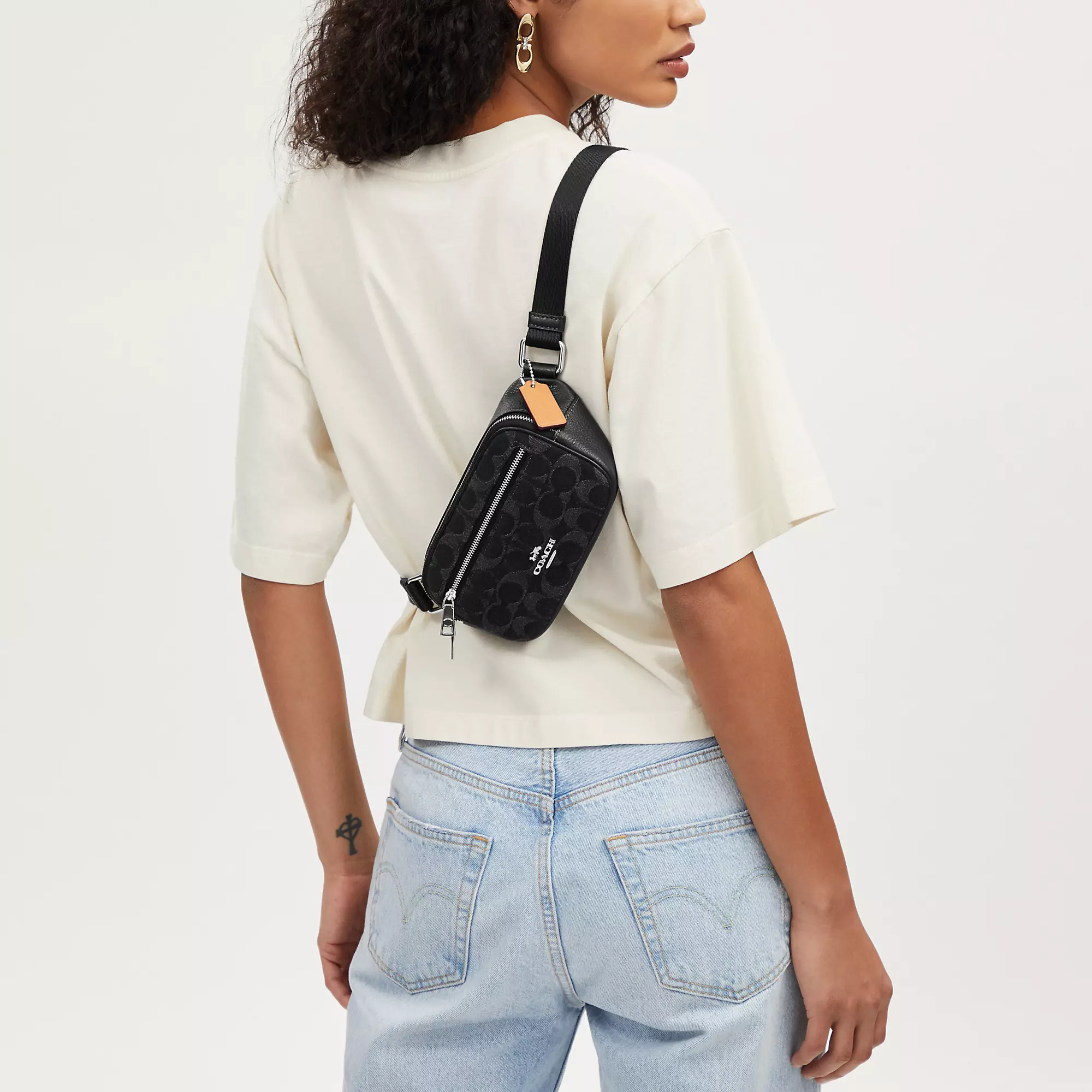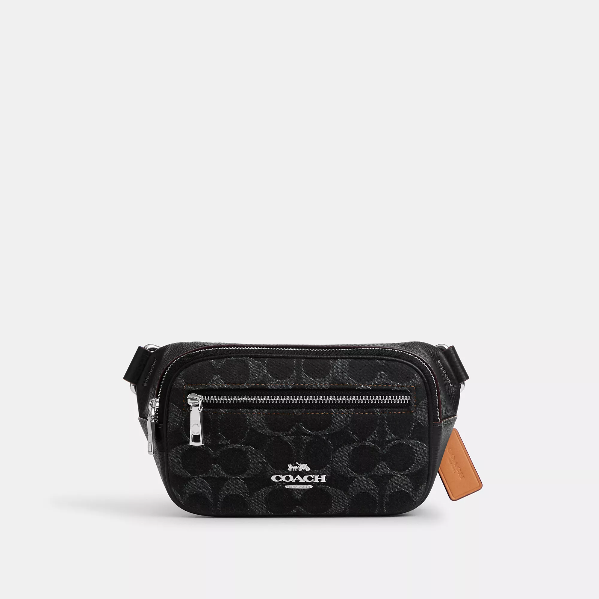 Signature denim and refined pebble leather Zip closure fabric lining Outside zip pocket Adjustable strap for wear at waist 8 1/2 (L) x 4 1/4 (H) x 2 1/4 (W) Style No. CQ186 | Coach Outlet Mini Belt Bag In Signature Denim - Black