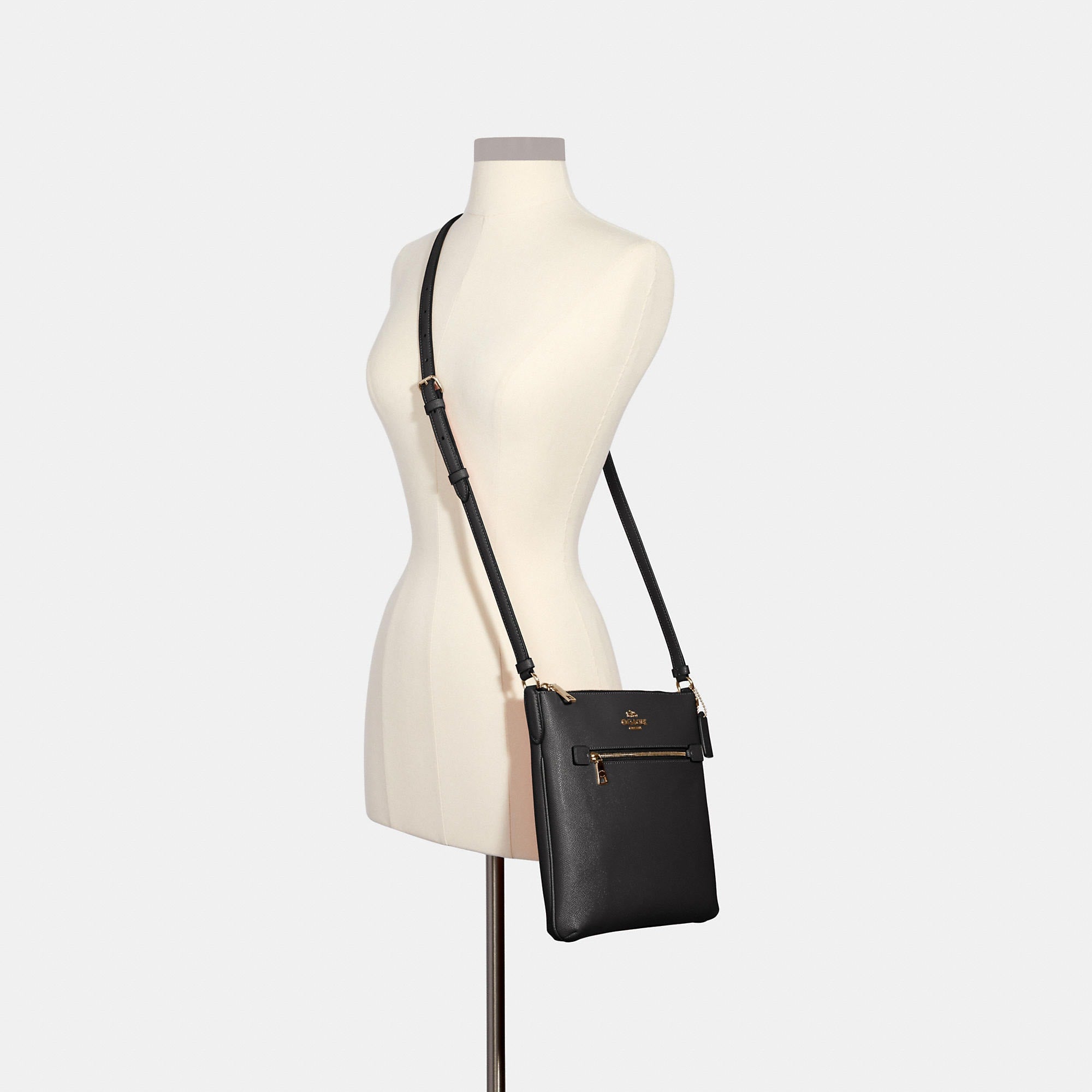 Crossgrain leather Inside multifunction pocket Zip-top closure fabric lining Outside zip pocket Adjustable strap with 21 3/4 drop for shoulder or crossbody wear 10 1/4 (L) x 9 3/4 (H) x 1 1/2 (W) Style No. C1556 | Coach Outlet Rowan File Bag - Black