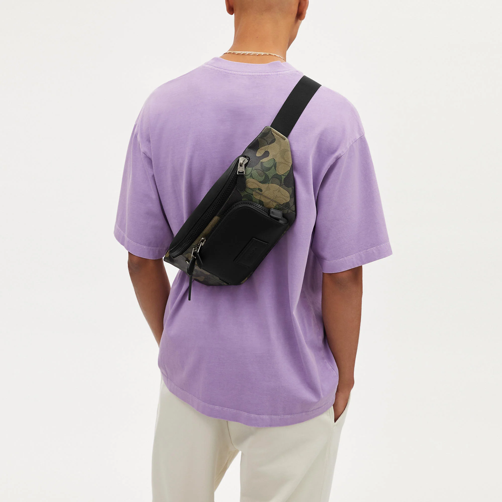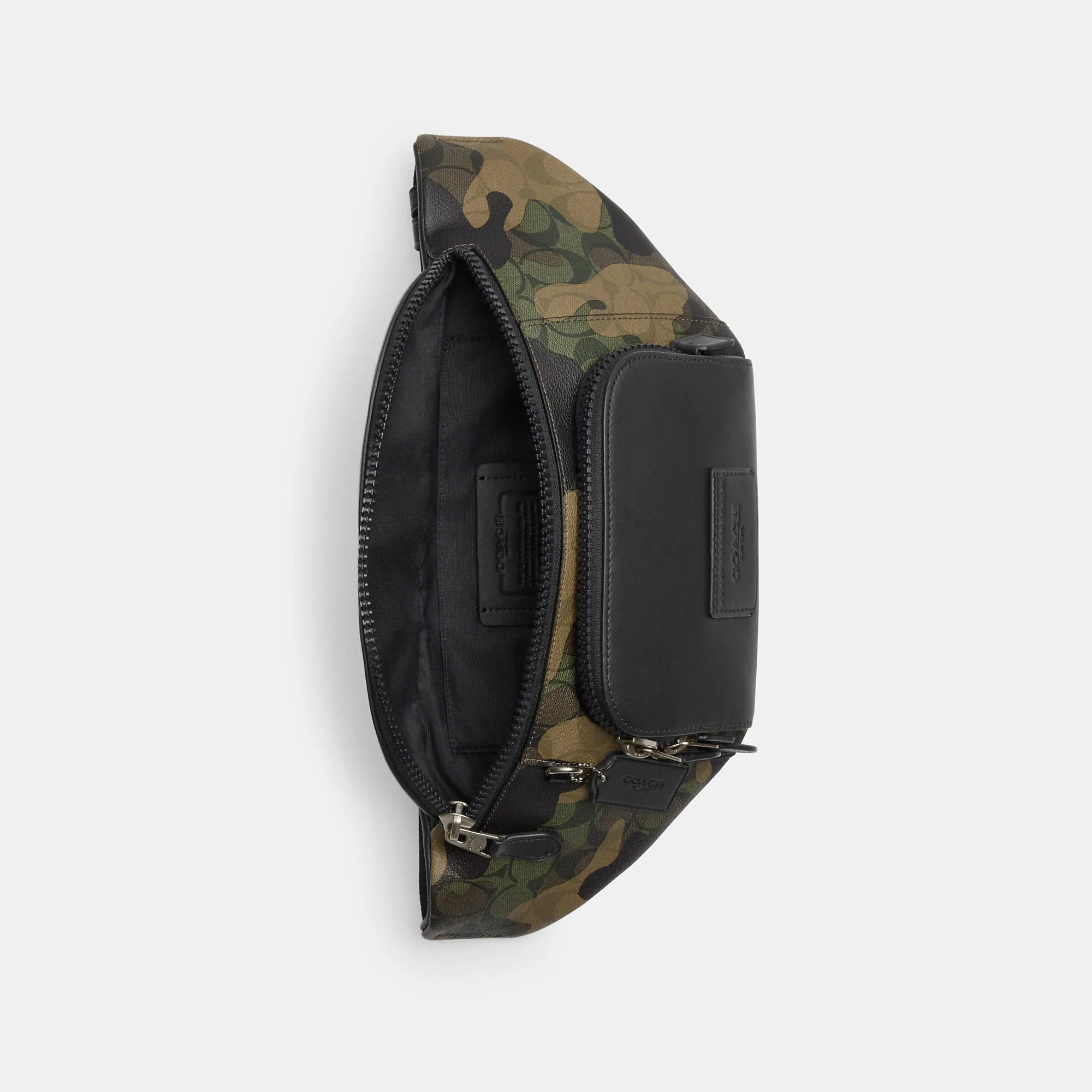 Signature coated canvas and smooth calf leather Inside multifunction pocket Zip closure fabric lining Outside zip pockets Adjustable strap with 49 length for wear at waist 16 (L) x 6 3/4 (H) x 2 3/4 (W) Style No. CM184 | Coach Outlet Track Belt Bag In Signature Canvas With Camo Print - Green