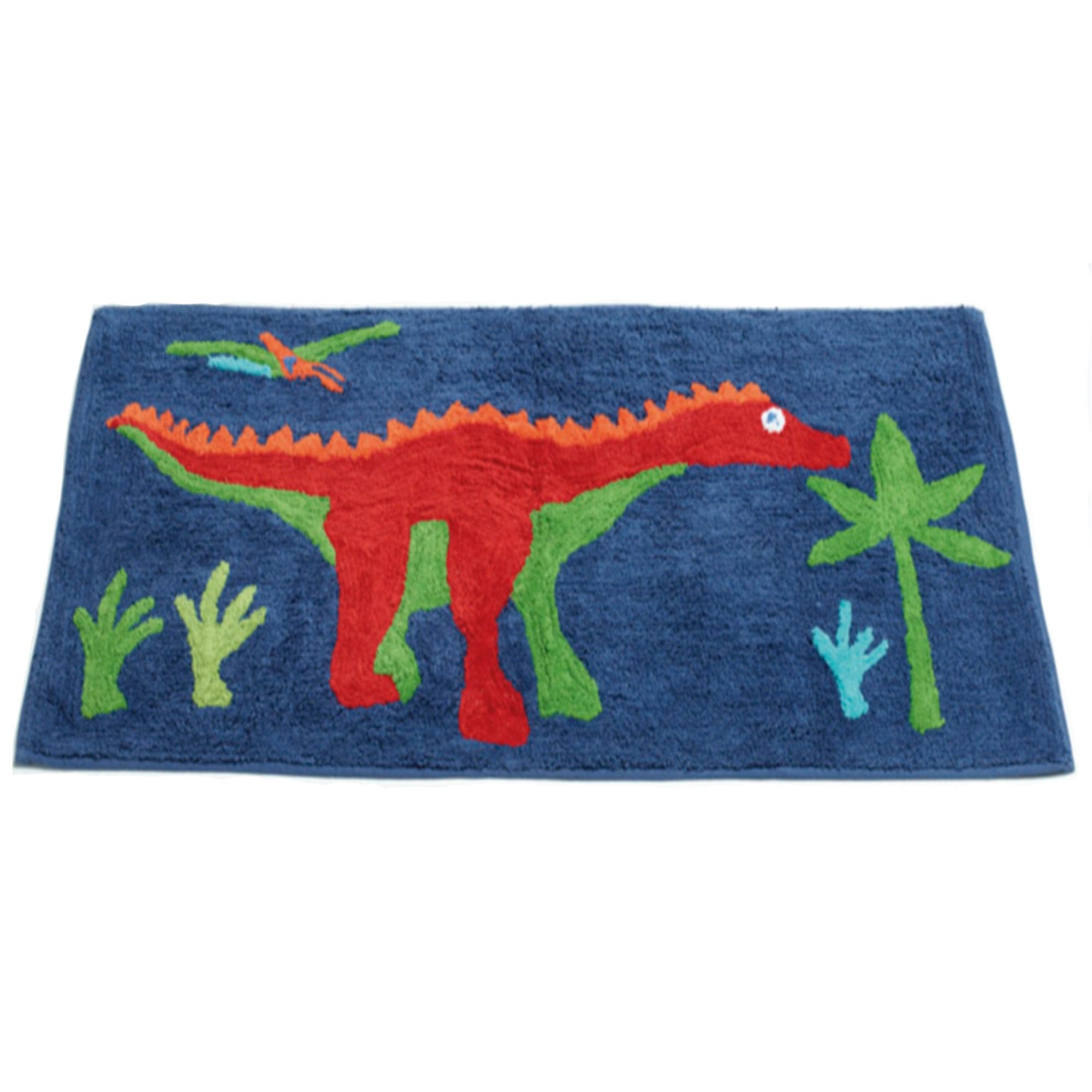 A super cute Dinosaur floor rug featuring a blue background and red dinosaur.