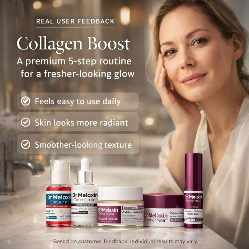 Collagen Boost is a 5-piece facial care kit for cosmetic use, designed to support the appearance of a smoother, more radiant-looking complexion as part of a daily skincare routine. Results may vary.