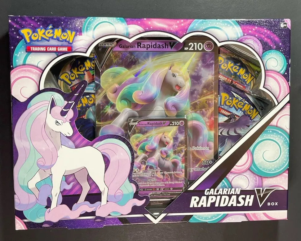 - Card Text:The Pokémon TCG: Galarian Rapidash V Box includes: