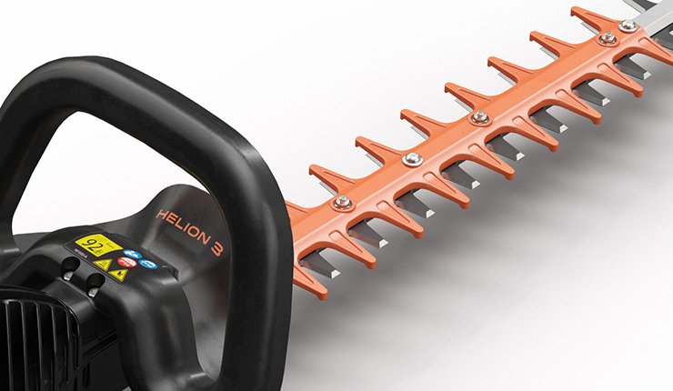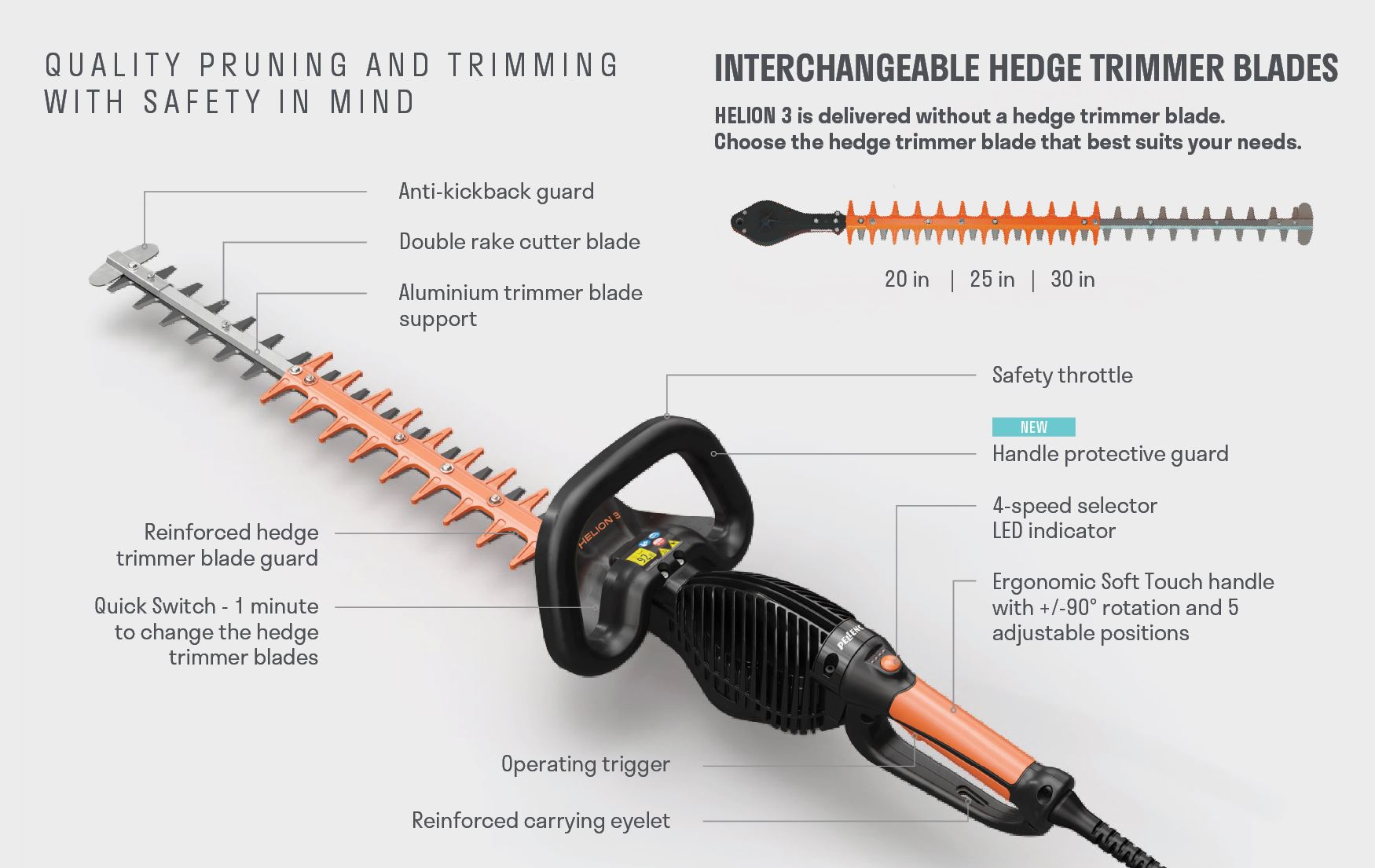 The HELION 3 professional electric hedge trimmer has a blade guard, an aluminum stiffener, carbon steel blades and a stainless steel anti-kickback guard.