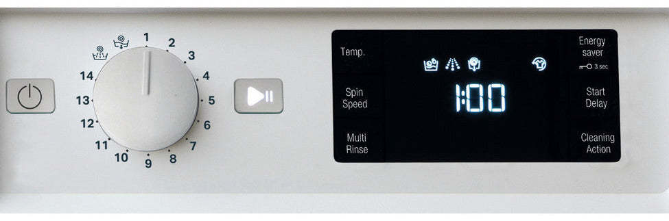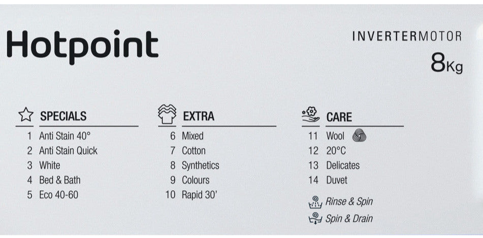 | Washing Programmes | Delicates / White / EcoCotton / Drain & spin / Rapid 30' / Delicates 30° / Wool 40° / Colours / Wool / Mixed/Magic 40° / Automatic programmes / Options / Rinse & Spin / Cotton 40° / Chrono 30°/Quick wash 30° / EcoCotton 40° / Synthetics 60° / EcoCotton 60° / Synthetics 40° / Synthetics / Cotton / Cotton 60° / Big Items/Duvet / Programs Button / Settings / Start/Pause / Spin / Handwash/Wool / Cold wash program / Handwash / Lingerie / Wool |