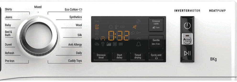 But that's not all, this dryer also features ActiveCare Technology which reduces fabric wear by up to 40%, ensuring your clothes last longer. It also has an Anti Allergy function that removes 99.9% of dust mites, making it perfect for families with sensitive skin.