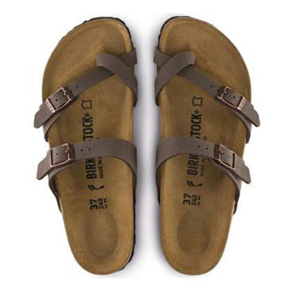 The Mayari is one of our most popular styles, year after year.? We have found that the Mayari sandal fits most feet exceptionally well.? Contoured cork footbeds provide great arch support and make this a truly comfortable sandal for almost any foot type, and for almost any event or occasion.