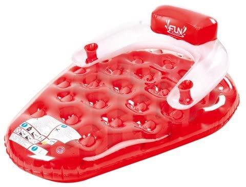 Fruity version of a full size pool lounger. Bright red and strawberry shaped. Sturdy coil-beam construction. Comfortable pillow and arm-rests. The latter incorporate drinks holders. Will support a weight of up to 80 kg.