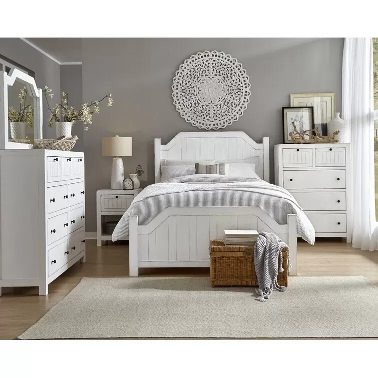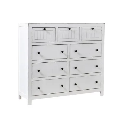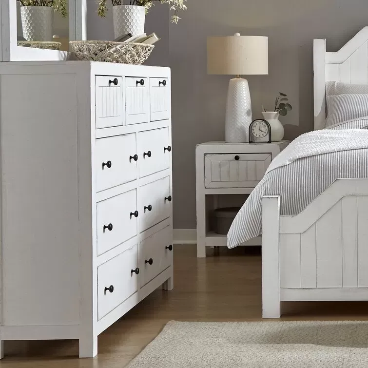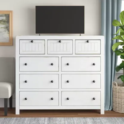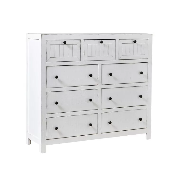 This classic 54 wide dresser adds an element of farmhouse style to your bedroom. living room. or home office. It's made of solid wood in a distressed white finish. It features a rectangular shape with three smaller upper drawers and six wide lower drawers. all drawers are fully extendable with metal slides and simple black hardware. The upper drawer features framed. planked fronts. offering a vintage-inspired look. An anti-tip kit is included. for added stability. Plus. this piece comes fully assembled. so you can start using it right away.